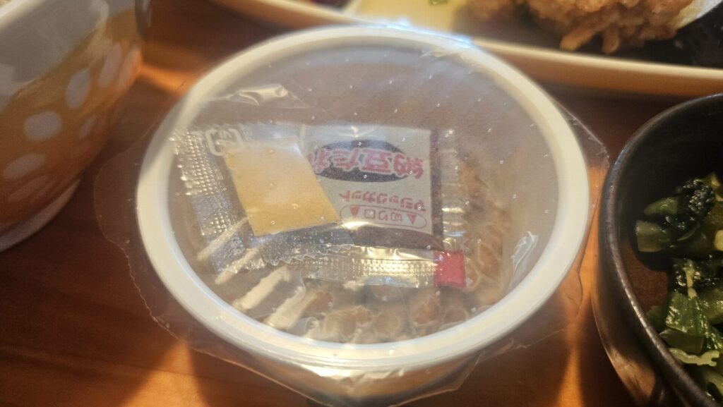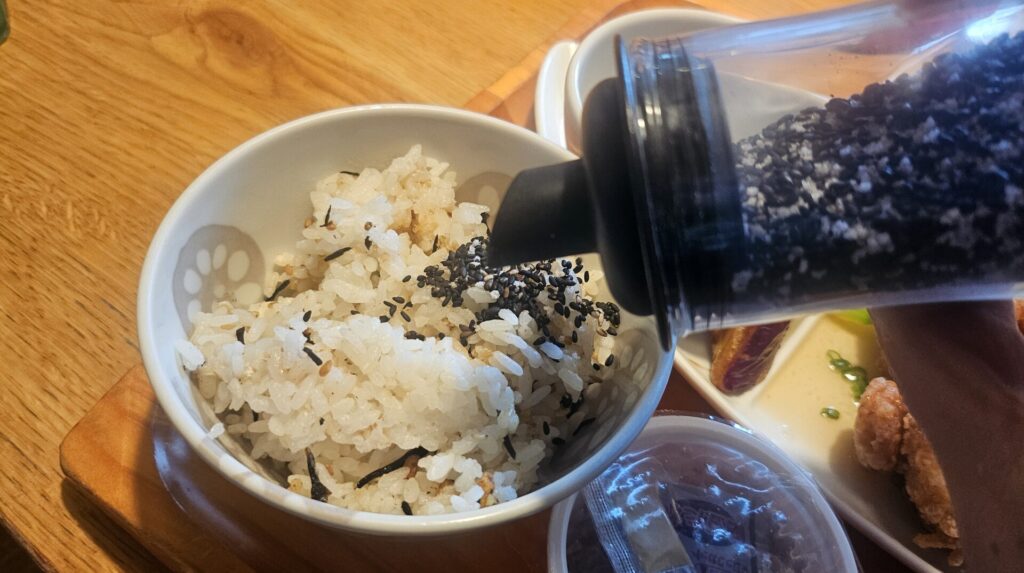 ご飯は五穀米。ごま塩ふりかけが置いてあったので、かけて美味しくいただきました。