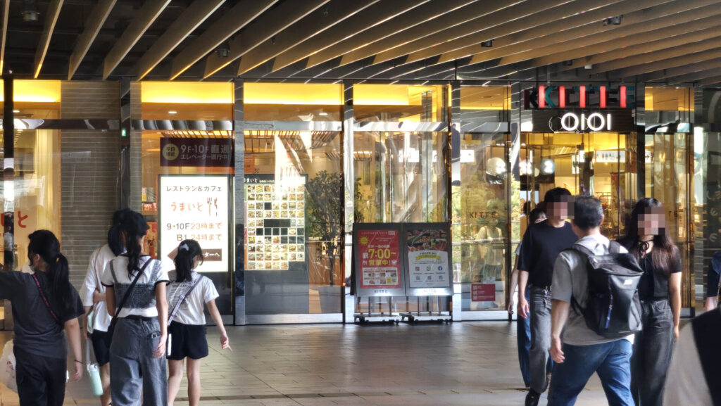 KITTE博多9階はレストラン街「うまいと」エリアにあり、通路も広く設計されています。エレベーター付近にはベビールームや多目的トイレもあり、食前・食後の利用にも便利です。駅ビル内という立地のため、食事の前後にショッピングやおみやげ探しも楽しめます。