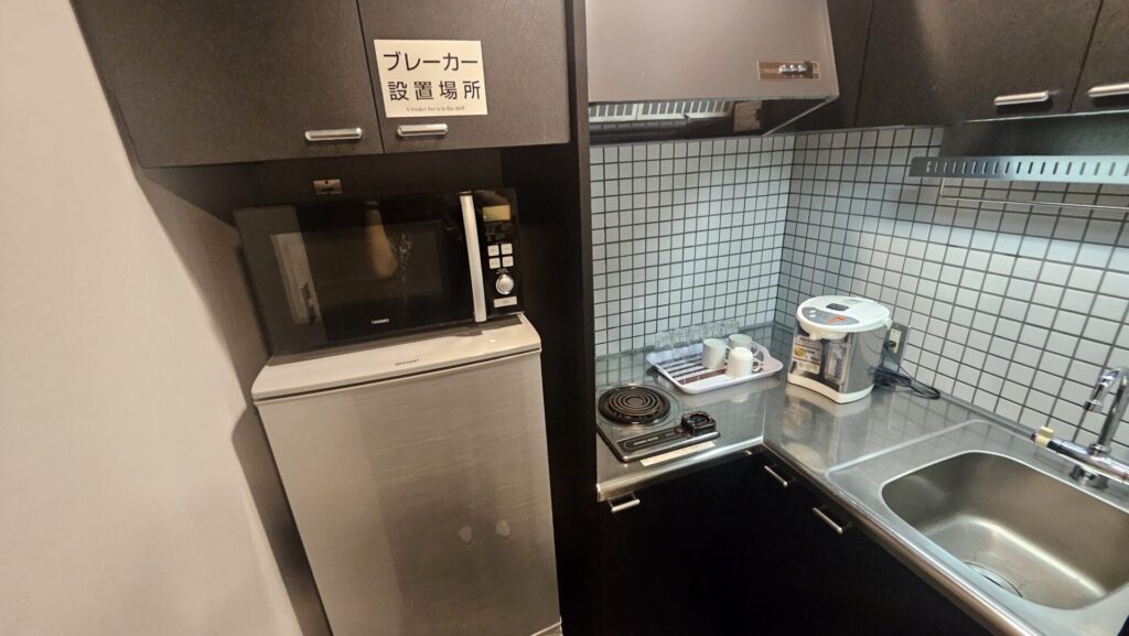 - ミニキッチンと家電: バリアフリールームを除くすべてのお部屋にミニキッチンが備わっており、冷蔵庫、電子レンジ、電気ケトルが設置されています。調理器具や食器類は有料レンタル制です。