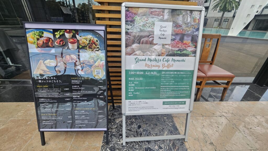 朝食ビュッフェ:1階の「グランドマスターズカフェ百道店」で、和洋折衷のビュッフェが朝7時から提供。宿泊外利用も可能。